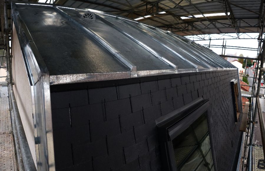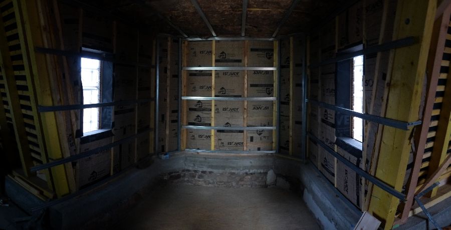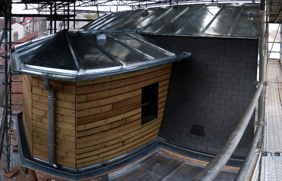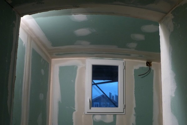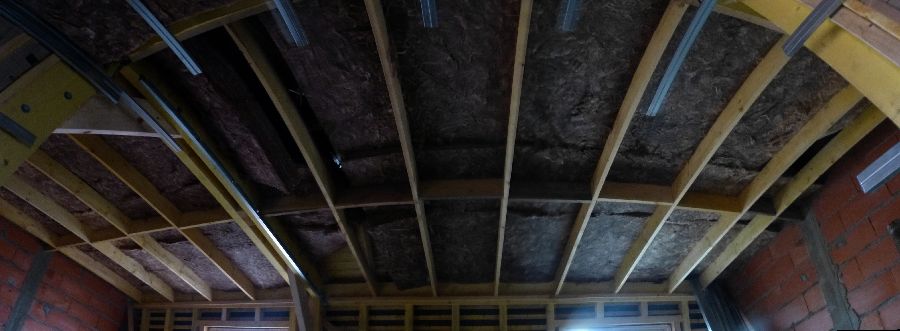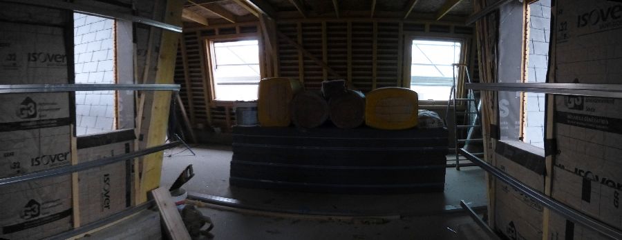 22 novembre 2013 - Couverture : terminée – Placo : cage d'escalier ; isolation pièce mansardée ; bandes SdB